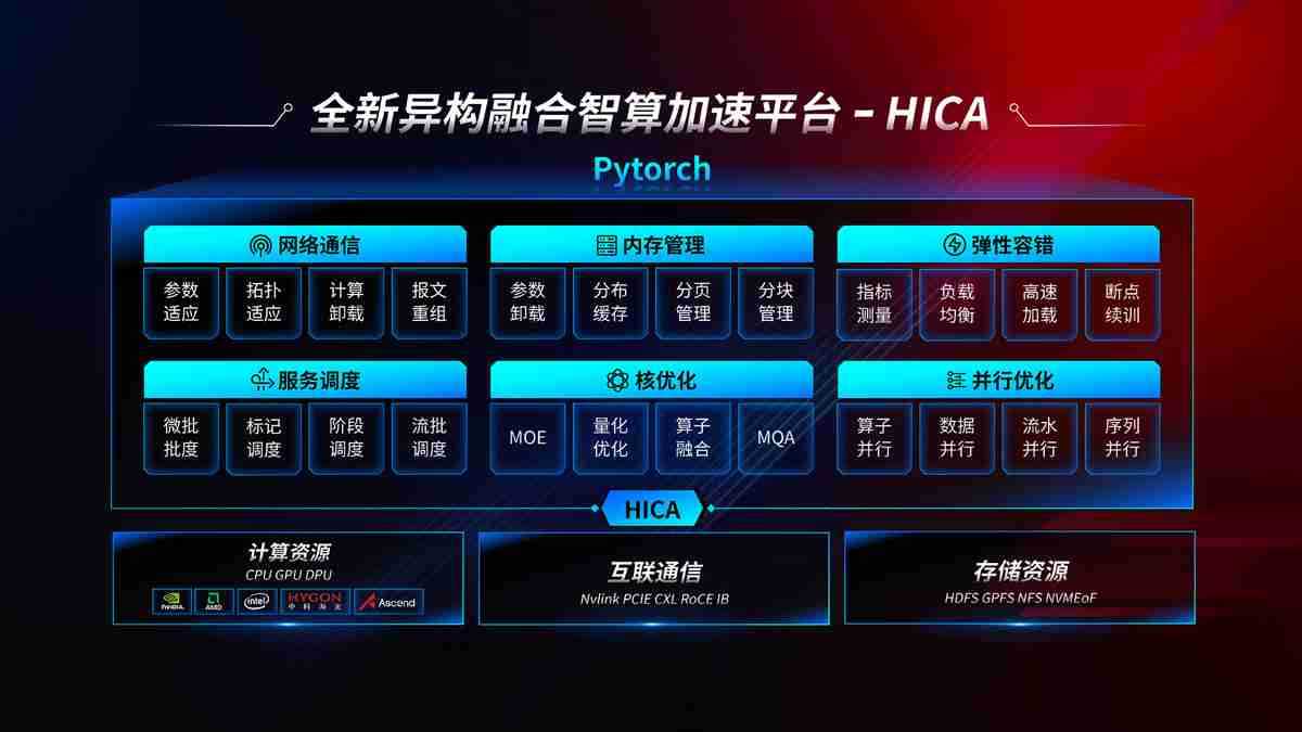 通过自研的服务层、、、中间适配层、、、、以及调度编排算法,,,,采用数据并行、、模型并行等多种并行方式,,把并行计算任务进行有效的分解,,使其分别由相应的软件栈和算力资源来承接。。。当GPU资源变化,,,HICA可以实时动态调度计算子任务并调整模型拓扑和架构,,,以充分聚合各种算力资源。。。。