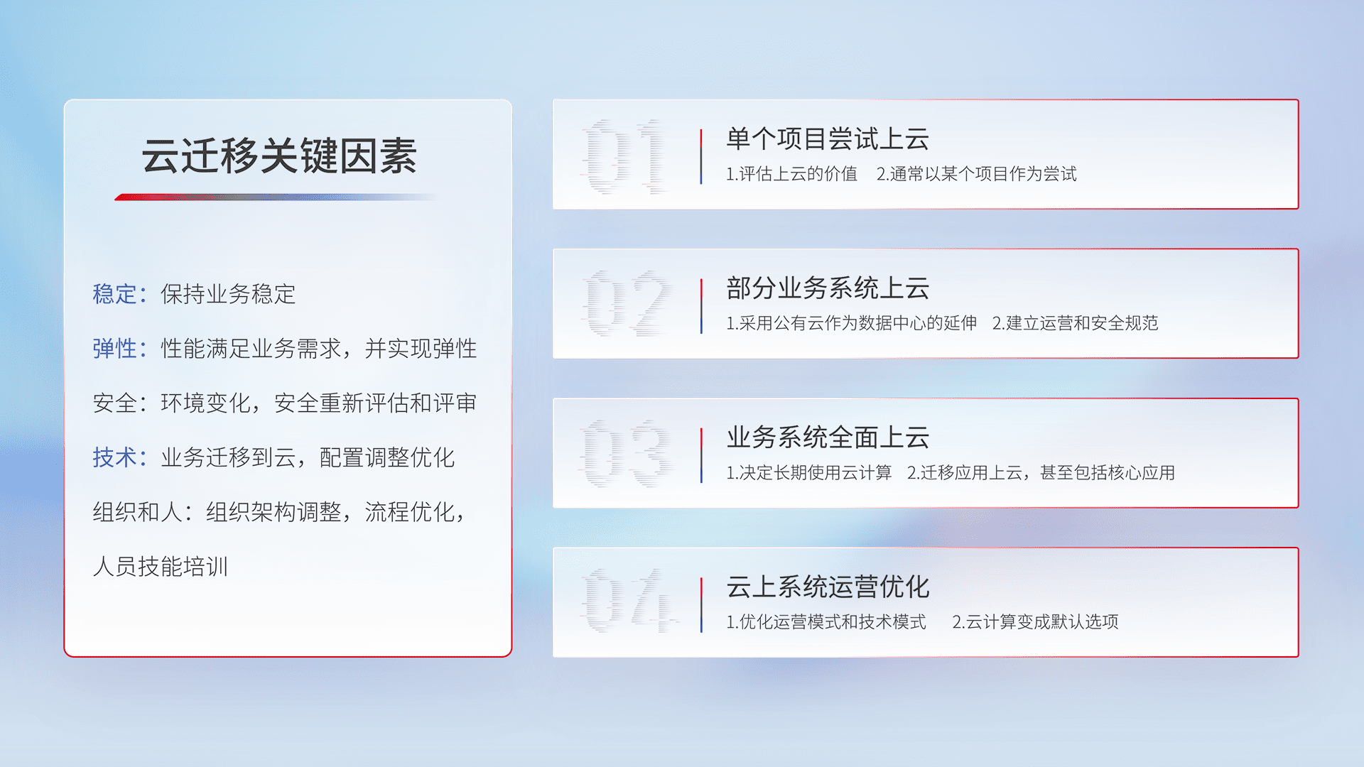 结合实际业务,,从规划设计、、云平台选型、、云原生改造、、、、数据迁移、、、集成交付,,,迁移全过程为客户识别最佳上云路径,,,做好风险识别管理,,,设计网络架构、、身份权限、、安全审计合规、、、操作审计、、日志审计、、、、监控告警策略、、、多站点容灾设计等,,对云上基础设施进行整体规划,,提升IT治理水平,,,以满足弹性、、、高可用、、高性能的需求。。。。