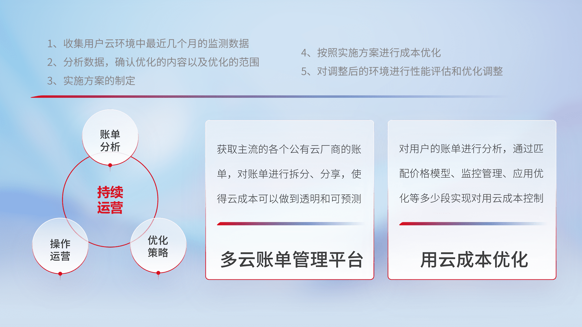 通过多云纳管,,,以统一的资源数据模型把客户的云资源进行抽象和封装,,进而实现对多云资源的统一操作,,,保障云资源管理的可靠性、、稳定性与可用性。。。量身定制化运维内容,,配置、、开发运维、、、、补丁管理、、、、备份、、、监控、、、认证和访问管理、、审计和日常巡检等,,,保障在用云过程中的可靠度,,,稳定度以及高可用率。。。。